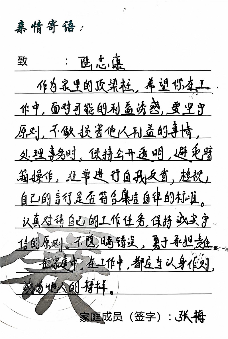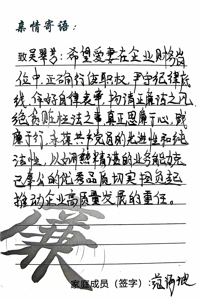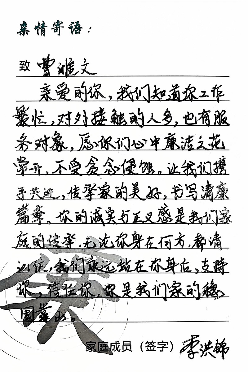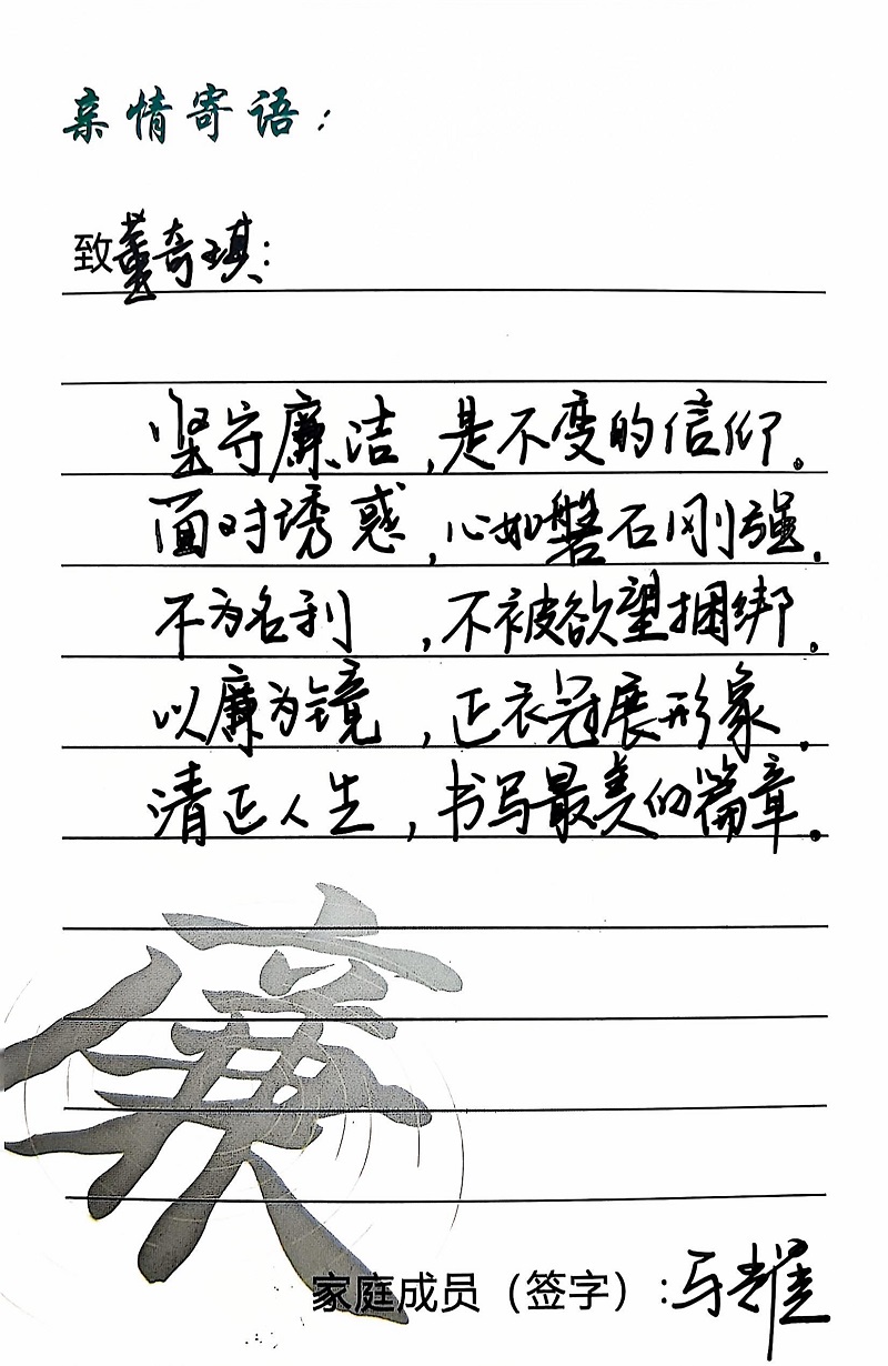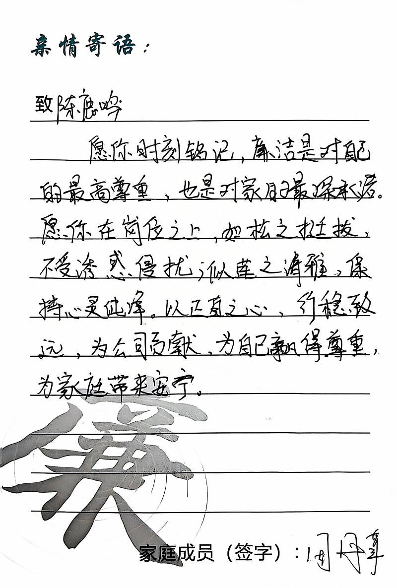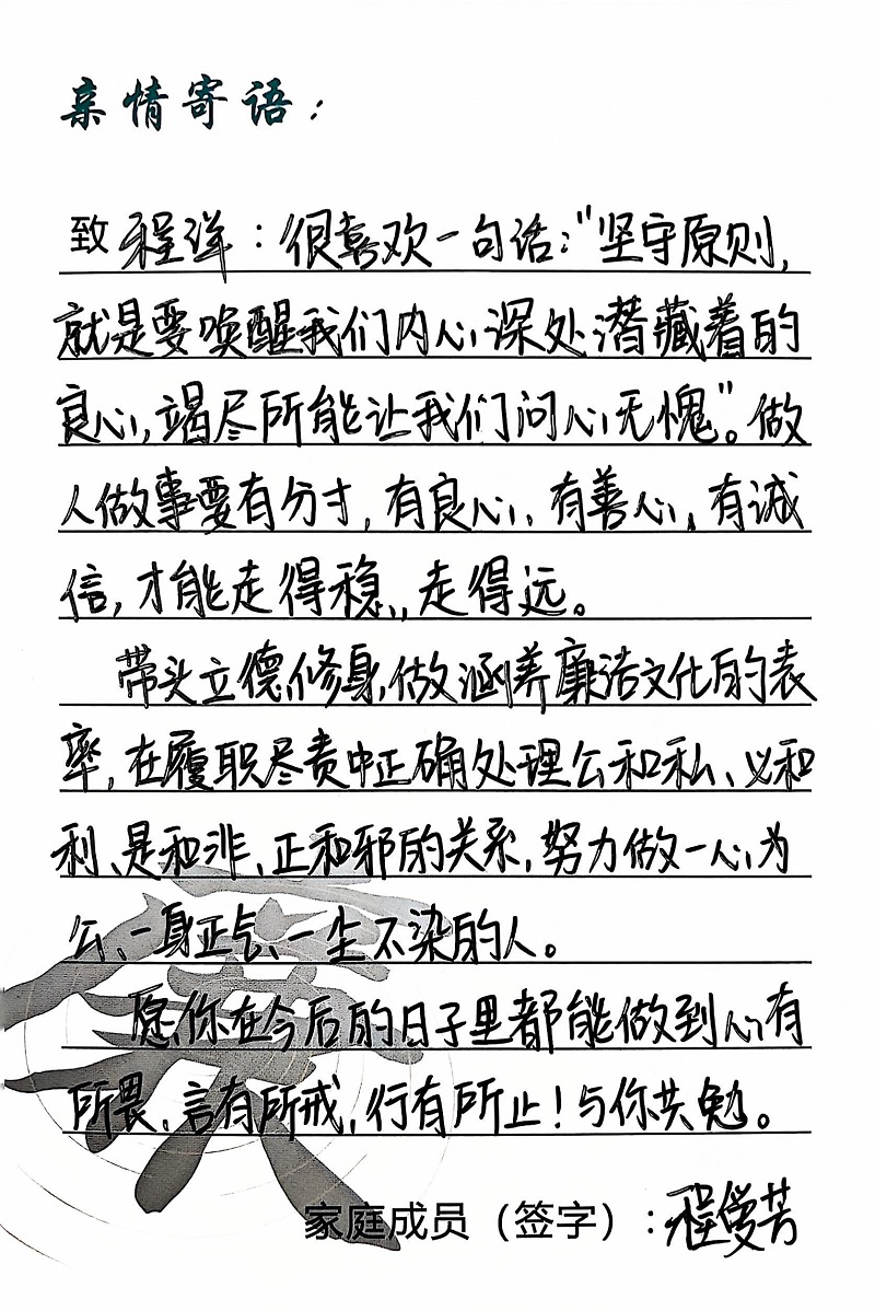 為深入學習黨的二十大精神,貫徹落實習近平總書記關于注重家庭家教家風建設的重要論述,營造公司崇廉、尚廉、踐廉、助廉的良好氛圍,城投公司組織開展了“家滿清風·廉潤城投”廉潔文化活動;顒娱_展以來,共征集廉政寄語210余條。經(jīng)各部門、子公司推薦,城投公司相關部門審核,評選出優(yōu)秀廉潔寄語43條,F(xiàn)將優(yōu)秀廉政寄語分批次進行展播,快來一起欣賞吧!