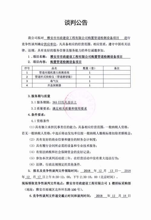 市政公司購置管道檢測(cè)設(shè)備項(xiàng)目的競(jìng)爭(zhēng)性談判公告