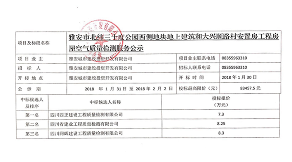 雅安市北緯三十度公園西側(cè)地塊地上建筑工程和大興順路村安置房工程房屋空氣質(zhì)量檢測服務(wù)公示