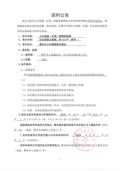 城投建工大興壹號(hào)(北苑)售樓部裝修競(jìng)爭(zhēng)性談判公告
