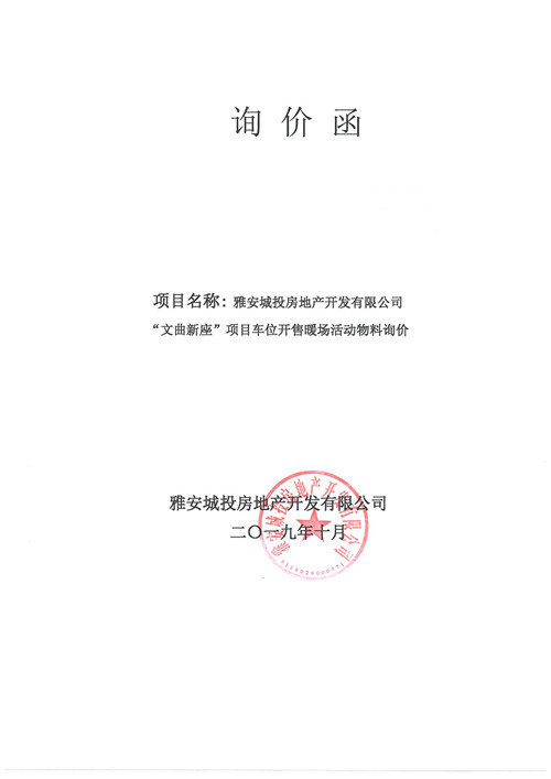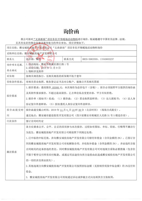 雅安城投房地產(chǎn)開(kāi)發(fā)有限公司“文曲新座”項(xiàng)目車位開(kāi)售暖場(chǎng)活動(dòng)物料詢價(jià)函