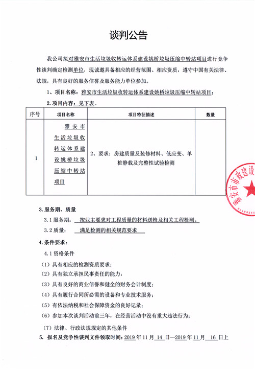 雅安市生活垃圾轉(zhuǎn)運(yùn)體系建設(shè)姚橋垃圾壓縮中轉(zhuǎn)站項(xiàng)目競(jìng)爭(zhēng)性談判公告