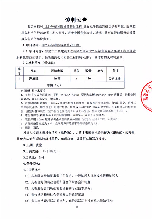 市政公司北外環(huán)福利院噪音整治工程競爭性談判公告