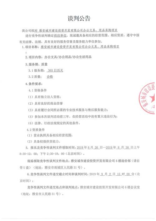 雅安城市建設(shè)投資開發(fā)有限公司辦公文具、用品采購項(xiàng)目競(jìng)爭(zhēng)性談判公告(第二次)