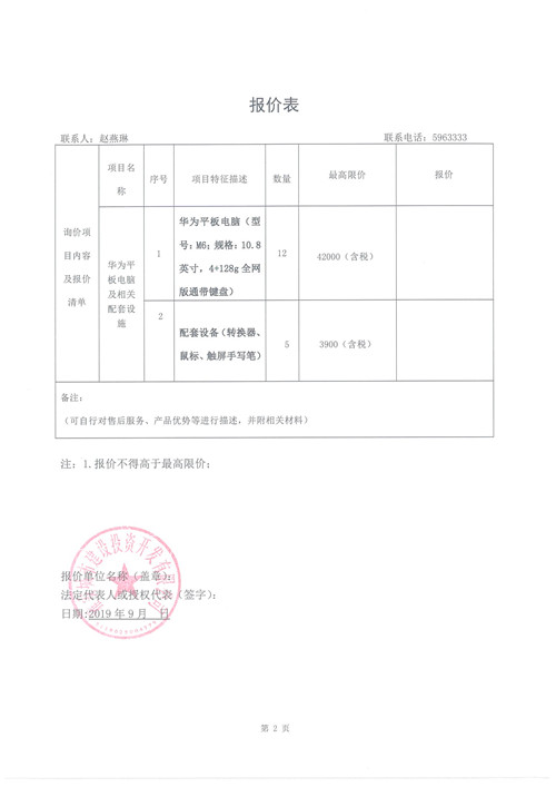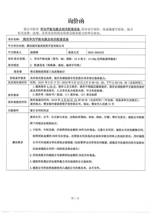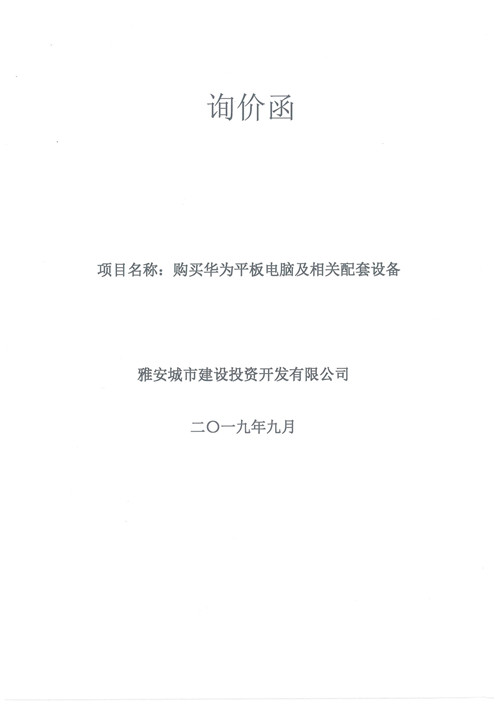 城投公司購買華為平板電腦及相關配套設備詢價函