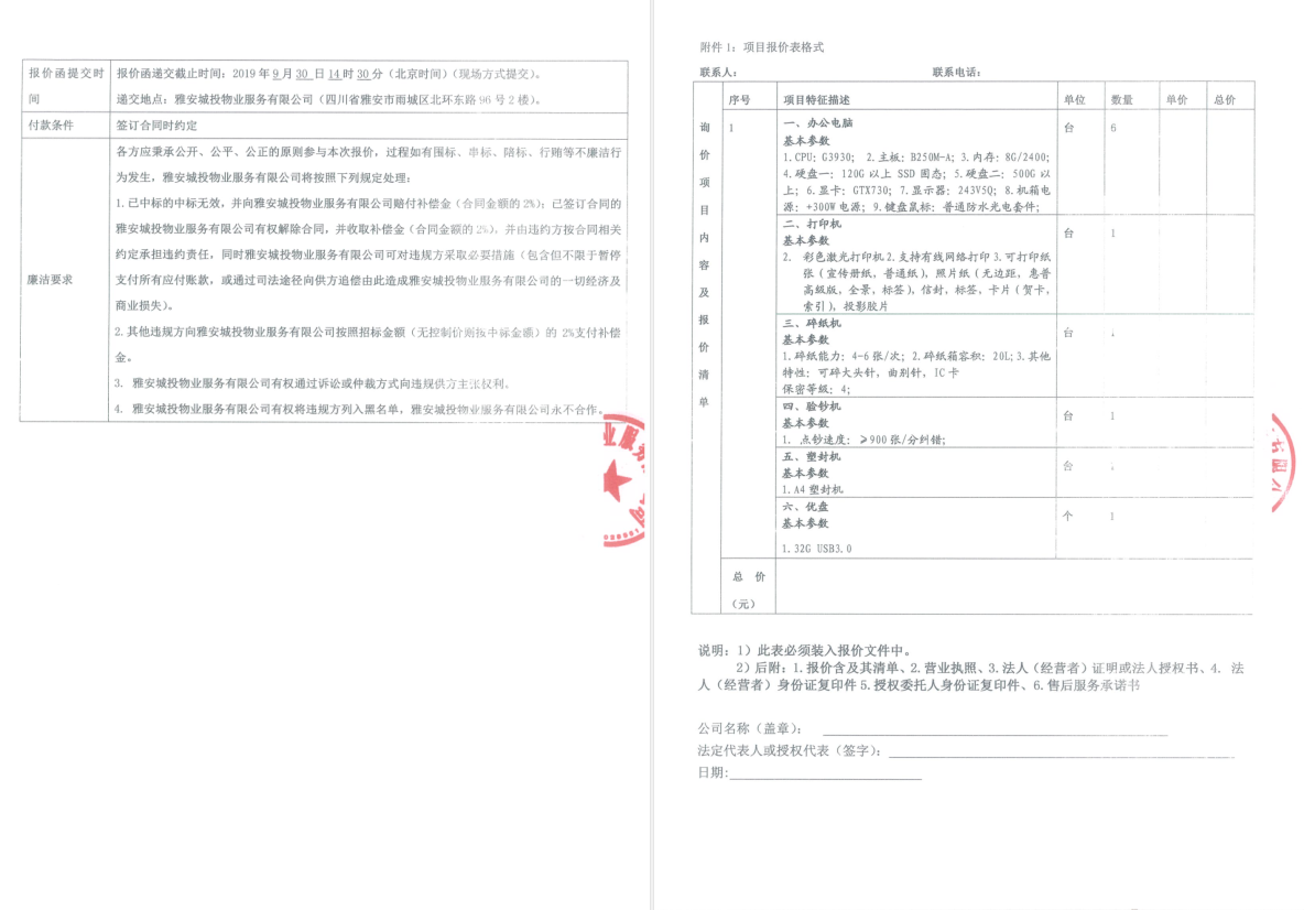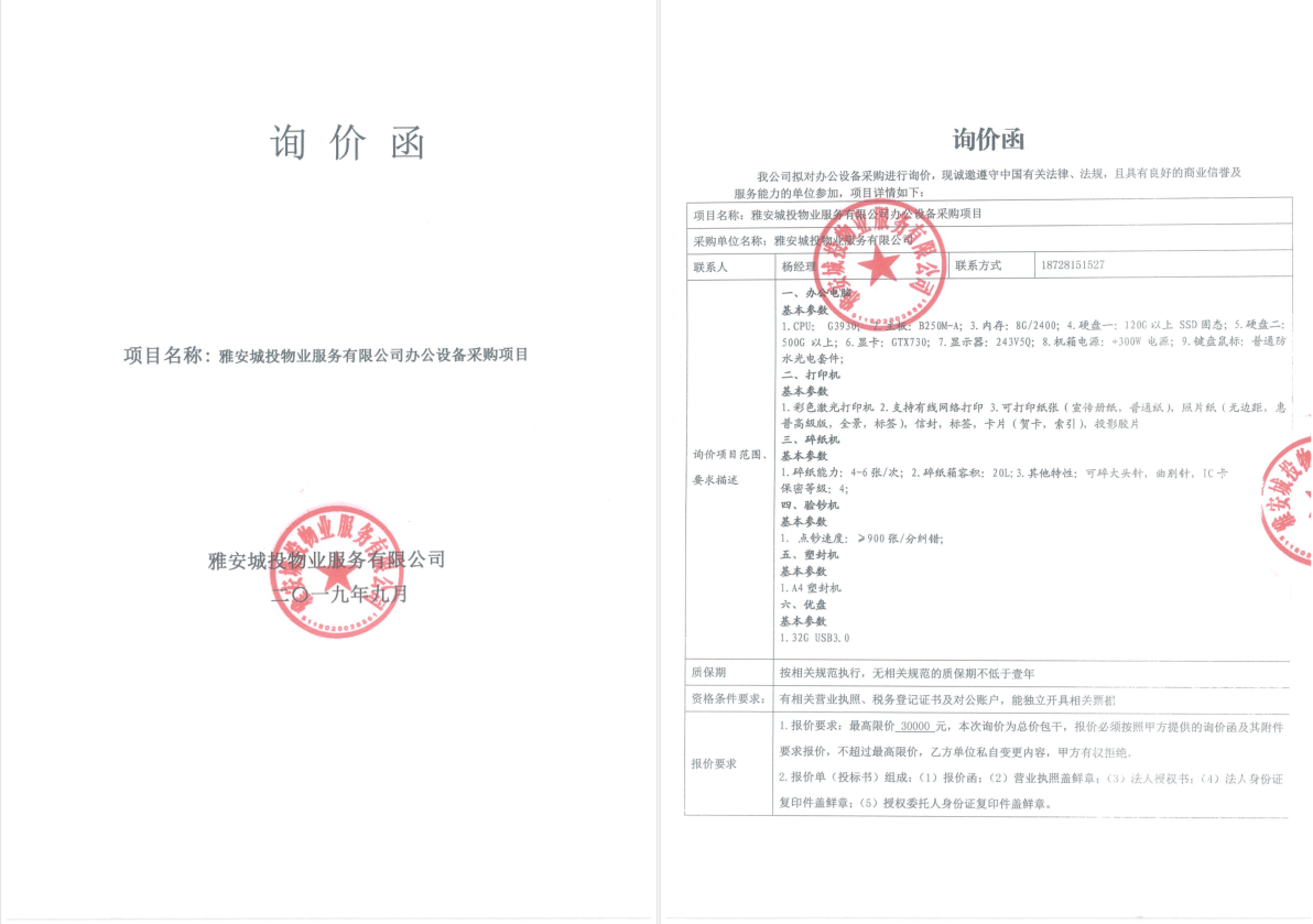 雅安城投物業(yè)詢(xún)價(jià)函(辦公設(shè)備)