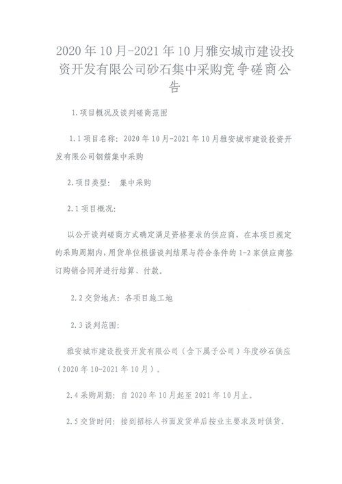 2020年10月-2021年10月雅安城市建設(shè)投資開發(fā)有限公司砂石集中采購(gòu)競(jìng)爭(zhēng)磋商公告
