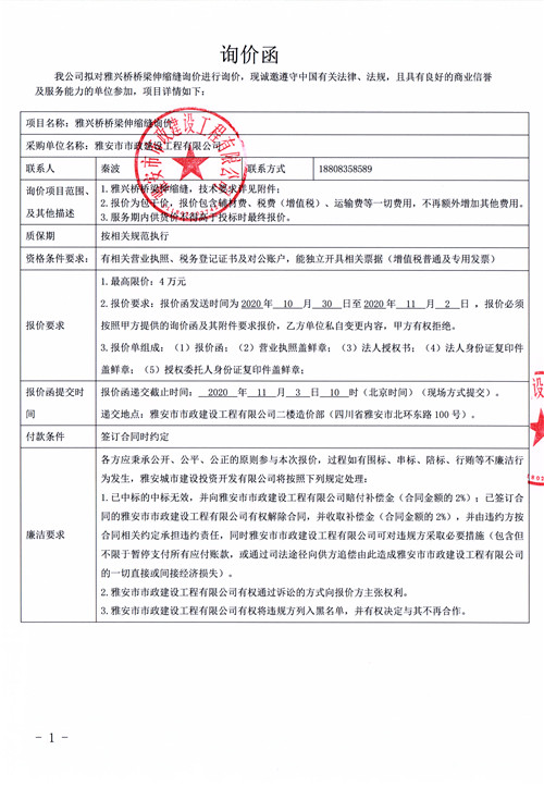 雅安市市政建設(shè)工程有限公司雅興橋橋梁伸縮縫詢價(jià)函