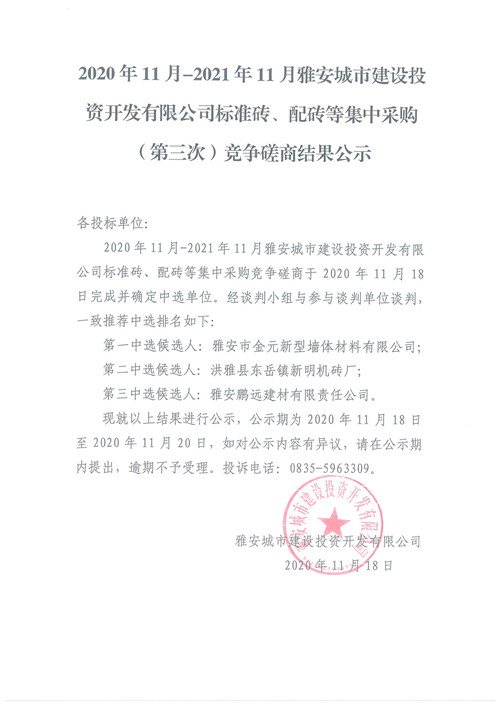 2020年11月-2021年11月雅安城市建設(shè)投資開發(fā)有限公司標(biāo)準(zhǔn)磚、配磚等集中采購(第三次)競爭磋商結(jié)果公示