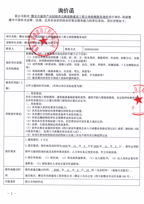 雅安市康養(yǎng)產(chǎn)業(yè)園銀杏北路道路建設(shè)工程主體檢測(cè)服務(wù)詢價(jià)函