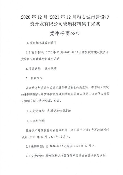 2020年12月-2021年12月雅安城市建設投資開發(fā)有限公司玻璃材料集中采購競爭磋商公告