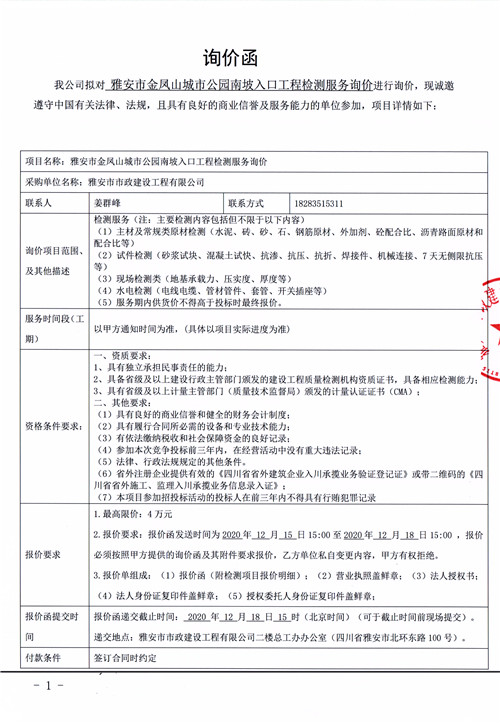 雅安市金鳳山城市公園南坡入口工程檢測(cè)服務(wù)詢(xún)價(jià)函