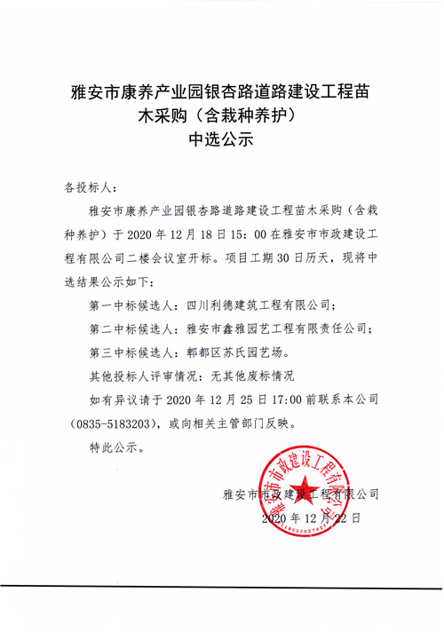 雅安市康養(yǎng)產(chǎn)業(yè)園銀杏路道路建設(shè)工程苗木采購(gòu)(含栽種養(yǎng)護(hù))中選公示
