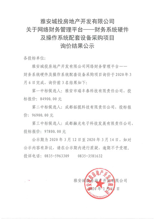 城投房地產(chǎn)公司關(guān)于網(wǎng)絡(luò)財務(wù)管理平臺——財務(wù)系統(tǒng)硬件及操作系統(tǒng)配套設(shè)備采購項目詢價結(jié)果公示