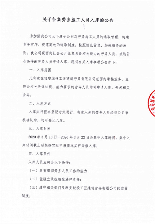 關于征集勞務施工人員入庫的公告