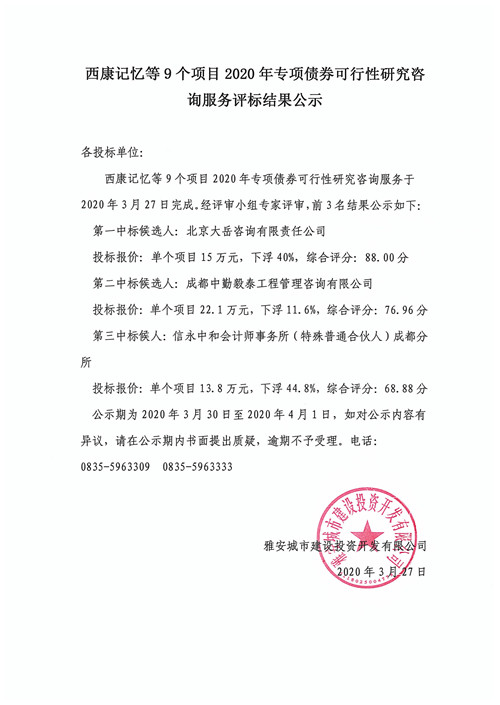 西康記憶等9個項目2020年專項債券可行性研究咨詢服務評標結(jié)果公示