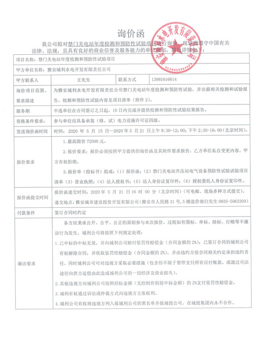 城利水電公司禁門(mén)關(guān)電站年度檢測(cè)和預(yù)防性試驗(yàn)項(xiàng)目詢(xún)價(jià)函