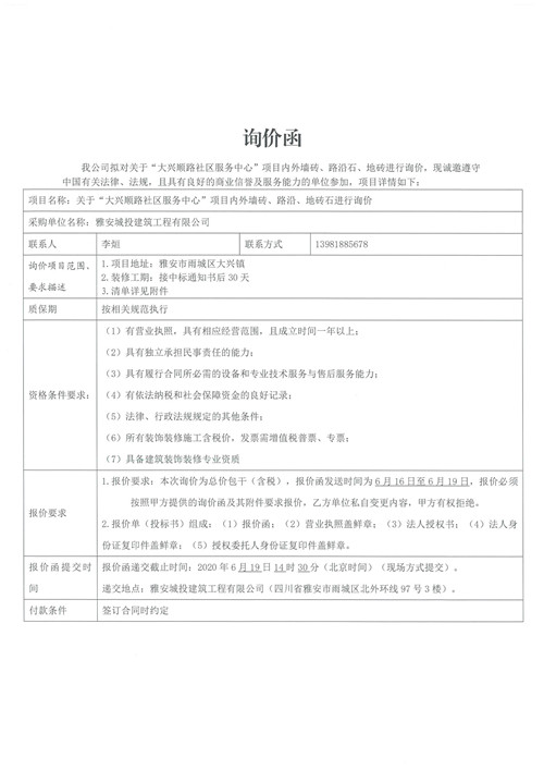 城投建工“大興順路社區(qū)服務(wù)中心”項(xiàng)目內(nèi)外墻磚、路沿石、地磚詢價函