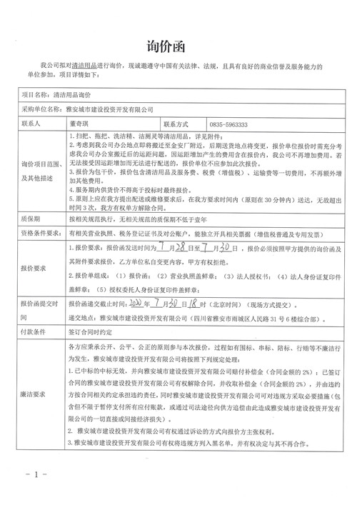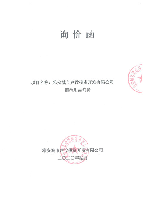 雅安城市建設(shè)投資開發(fā)有限公司清潔用品詢價函