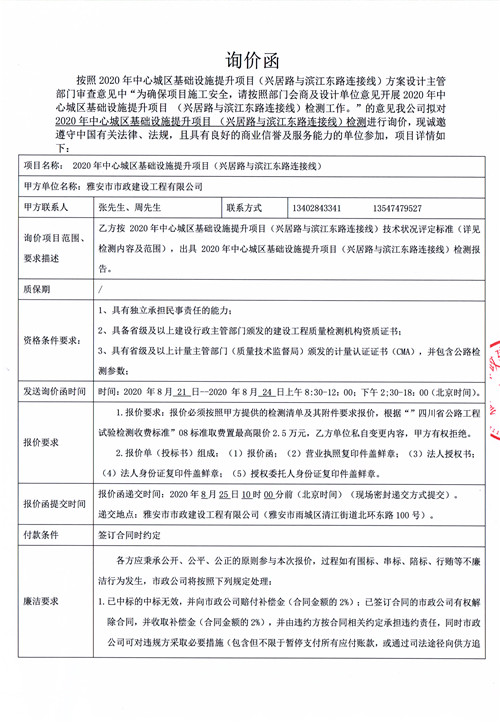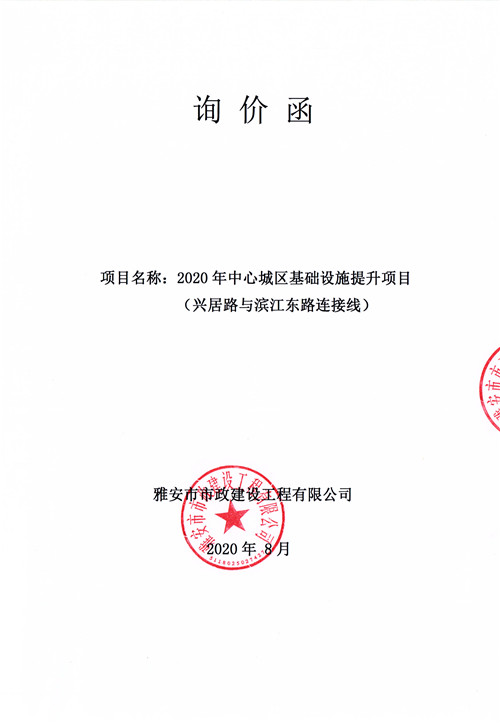 雅安市市政建設工程有限公司2020年中心城區(qū)基礎設施提升項目(興居路與濱江東路連接線)詢價函