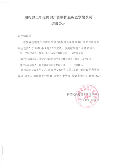 城投建工年度內(nèi)部廣告制作服務(wù)競爭性談判結(jié)果公示