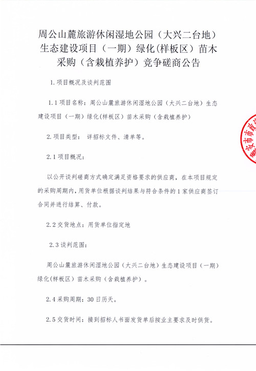 周公山麓旅游休閑濕地公園(大興二臺地)生態(tài)建設(shè)項(xiàng)目(一期)綠化(樣板區(qū))苗木采購(含栽植養(yǎng)護(hù))競爭磋商公告