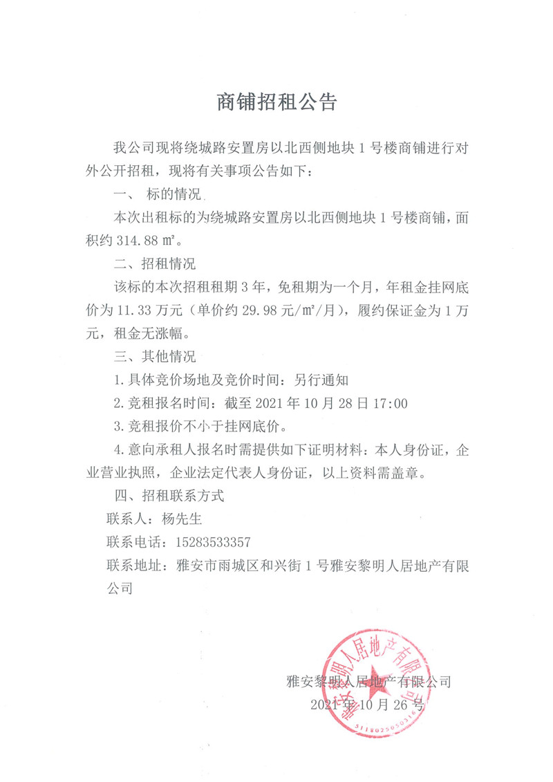 繞城路安置房以北西側地塊1號樓商鋪招租公告