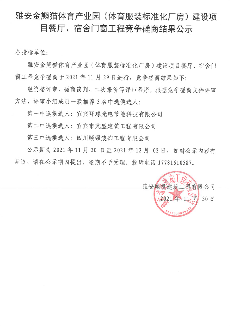 雅安金熊貓?bào)w育產(chǎn)業(yè)園(體育服裝標(biāo)準(zhǔn)化廠房)建設(shè)項(xiàng)目餐廳、宿舍門窗工程競爭磋商結(jié)果公示