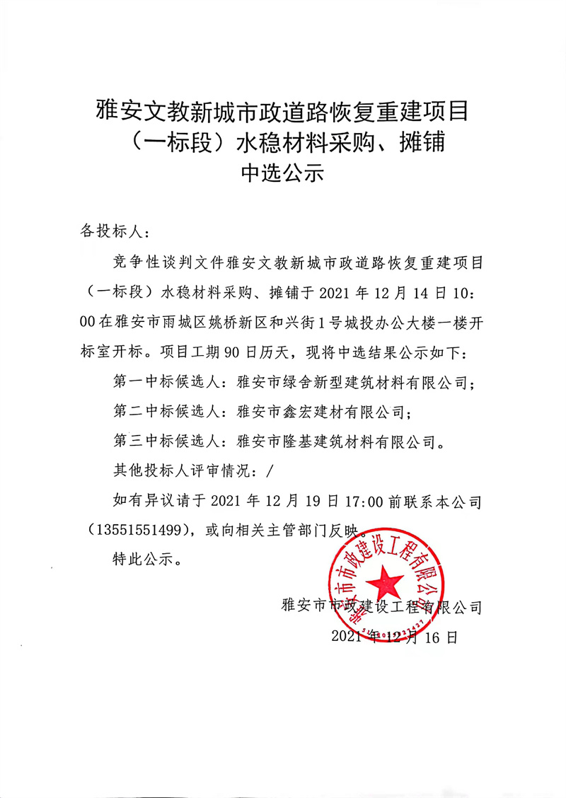 雅安文教新城市政道路恢復(fù)重建項目(一標段)水穩(wěn)層材料采購、攤鋪中選公示