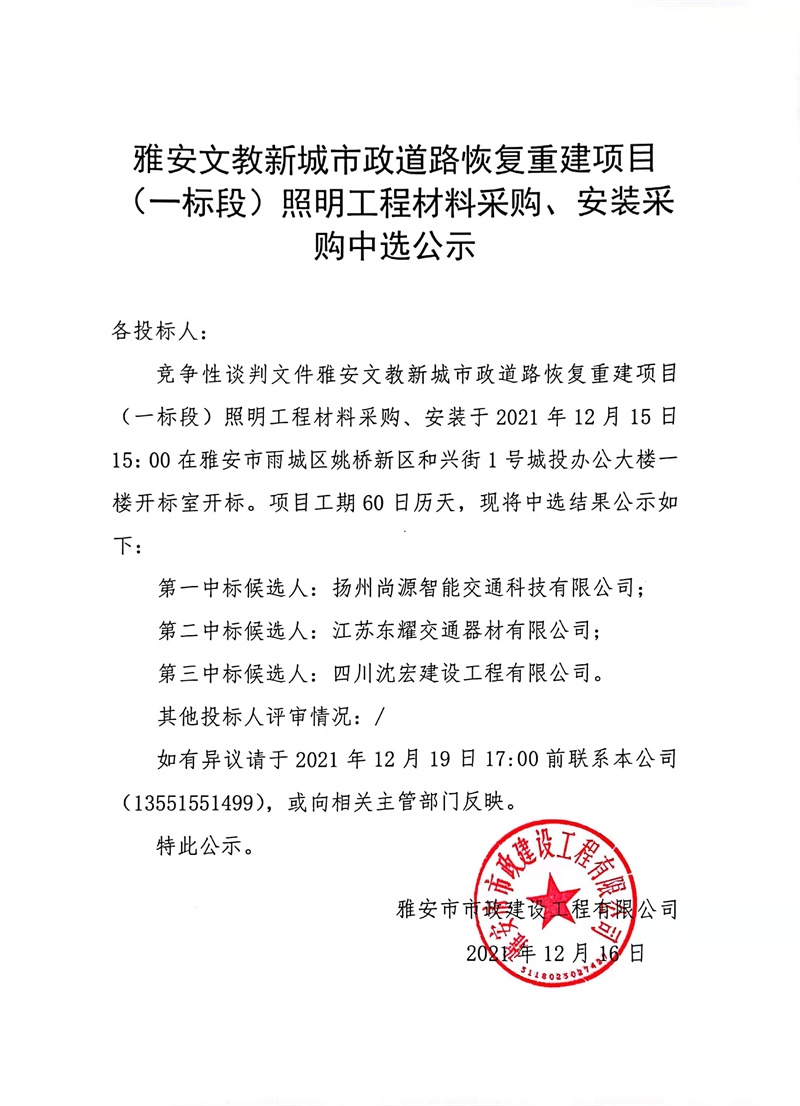 雅安文教新城市政道路恢復(fù)重建項目(一標段)照明工程材料采購、安裝采購中選公示
