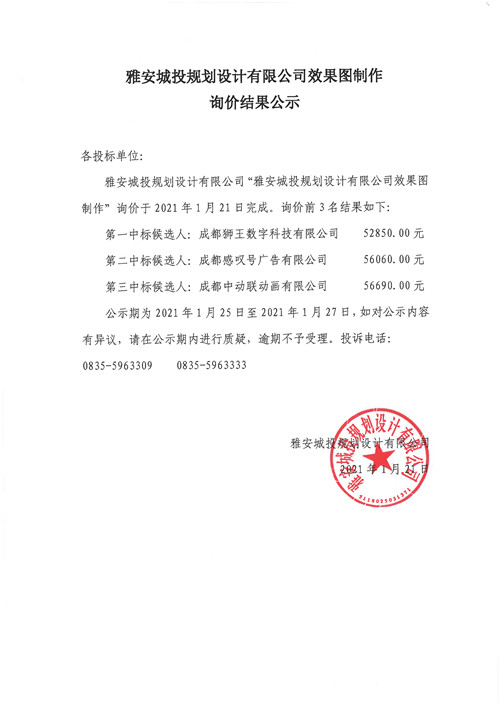 雅安城投規(guī)劃設(shè)計有限公司效果圖制作詢價結(jié)果公示