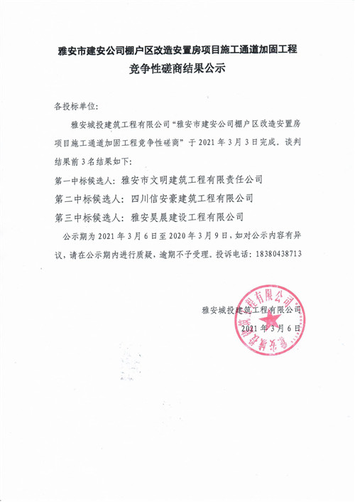 城投建工公司雅安市建安公司棚戶區(qū)改造安置房項(xiàng)目施工通道加固工程競(jìng)爭(zhēng)性磋商結(jié)果公示