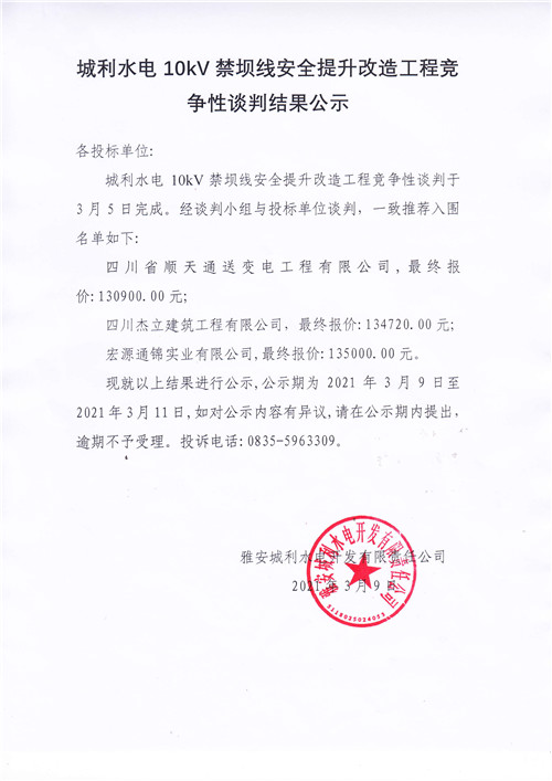 城利水電公司10kV禁壩線安全提升改造工程競爭性談判結果公示