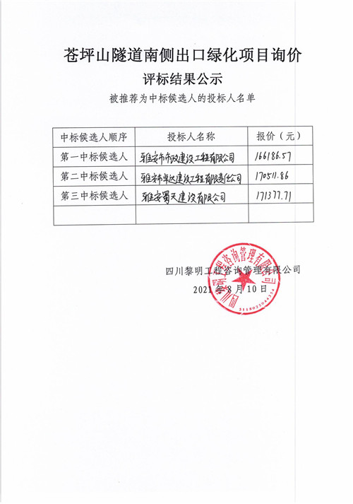 黎明咨詢公司蒼坪山隧道南側(cè)出口綠化項目詢價評標結(jié)果公示