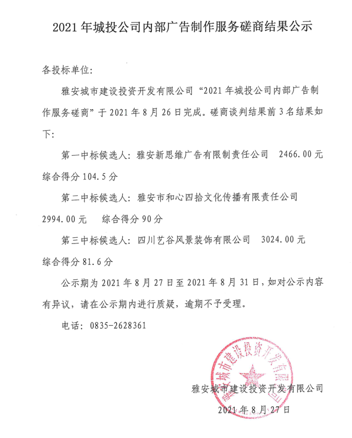 2021年城投公司內(nèi)部廣告制作服務磋商結(jié)果公示