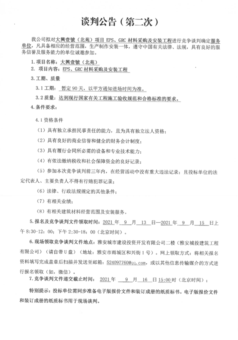 大興壹號(hào)(北苑)項(xiàng)目EPS、GRC材料采購(gòu)及安裝工程競(jìng)爭(zhēng)談判公告(第二次)