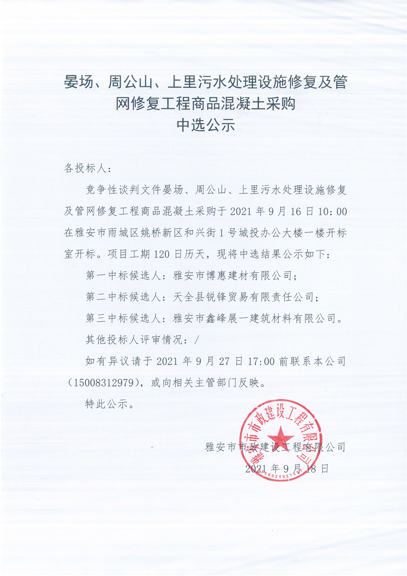 晏場、周公山、上里污水處理設(shè)施修復(fù)及管網(wǎng)修復(fù)工程商品混凝土采購競爭性談判結(jié)果公示