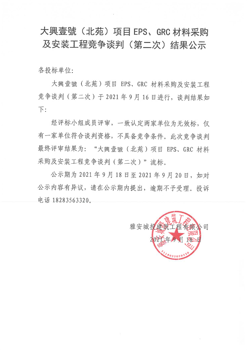 大興壹號(hào)(北苑)項(xiàng)目EPS、GRC材料采購及安裝工程競爭談判(第二次)結(jié)果公示
