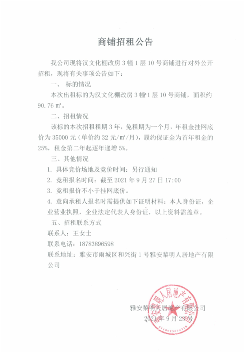 漢文化棚改房3幢1層10號(hào)商鋪對(duì)外招租公告