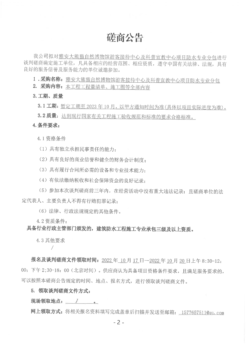 雅安大熊貓自然博物館游客接待中心及科普宣教中心項(xiàng)目防水專(zhuān)業(yè)分包談判磋商公告