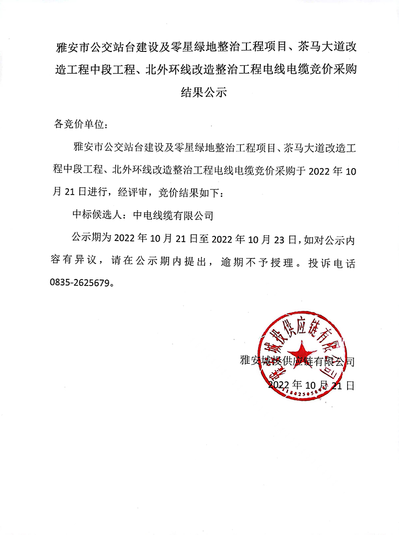 雅安市公交站臺(tái)建設(shè)及零星綠地整治工程項(xiàng)目、茶馬大道改造工程中段工程、北外環(huán)線改造整治工程電線電纜采購(gòu)競(jìng)價(jià)結(jié)果公告