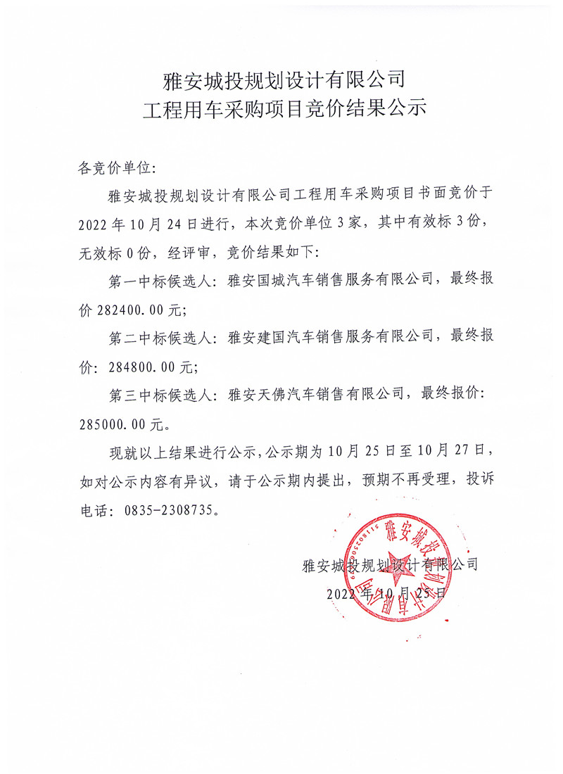 雅安城投規(guī)劃設(shè)計(jì)有限公司工程用車采購項(xiàng)目競(jìng)價(jià)結(jié)果公示