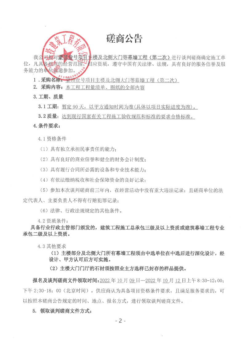 蒙頂壹號(hào)項(xiàng)目主樓及北側(cè)大門(mén)等幕墻工程(第二次)談判磋商公告