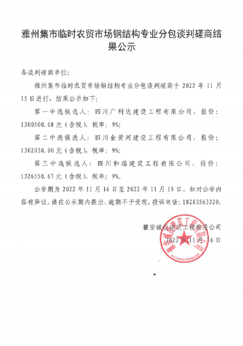 雅州集市臨時(shí)農(nóng)貿(mào)市場(chǎng)鋼結(jié)構(gòu)專業(yè)分包談判磋商結(jié)果公示
