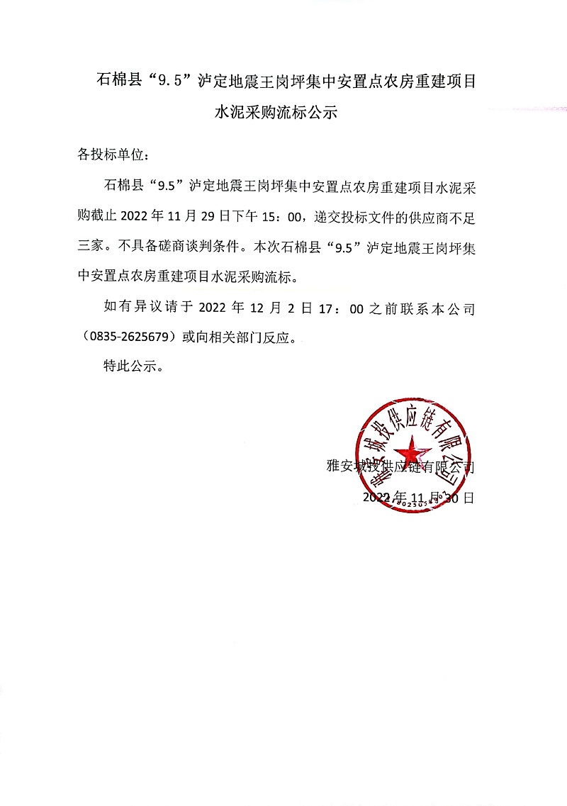 石棉縣“9.5”瀘定地震王崗坪集中安置點(diǎn)農(nóng)房重建項(xiàng)目水泥采購流標(biāo)公示