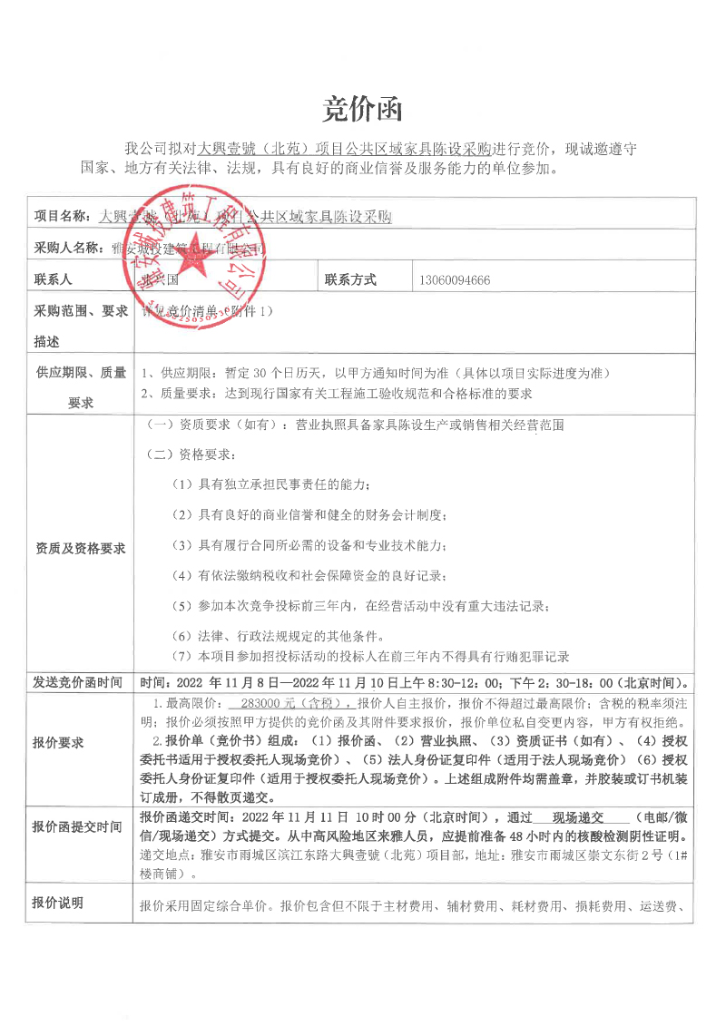大興壹號(北苑)項目公共區(qū)域家具陳設(shè)采購競價函