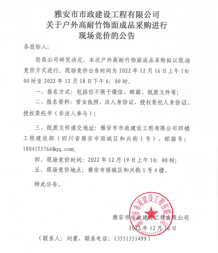 雅安市市政建設(shè)工程有限公司關(guān)于戶外高耐竹飾面成品采購(gòu)進(jìn)行現(xiàn)場(chǎng)競(jìng)價(jià)公告