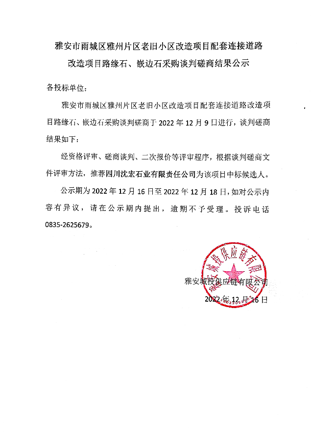 雅安市雨城區(qū)雅州片區(qū)老舊小區(qū)改造項(xiàng)目配套連接道路改造項(xiàng)目路緣石、嵌邊石采購談判磋商結(jié)果公示