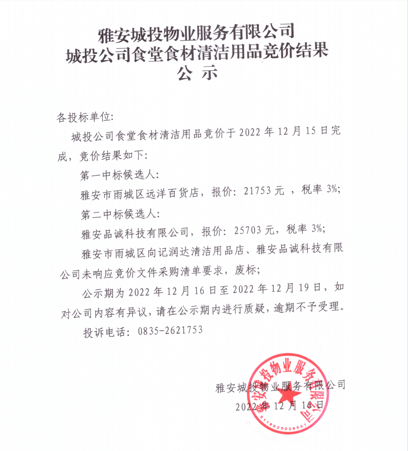 雅安城投物業(yè)服務(wù)有限公司城投公司食堂食材清潔用品競(jìng)價(jià)結(jié)果公示