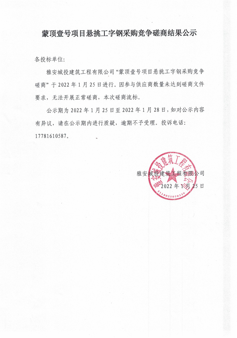 蒙頂壹號項目懸挑工字鋼采購競爭磋商結果公示